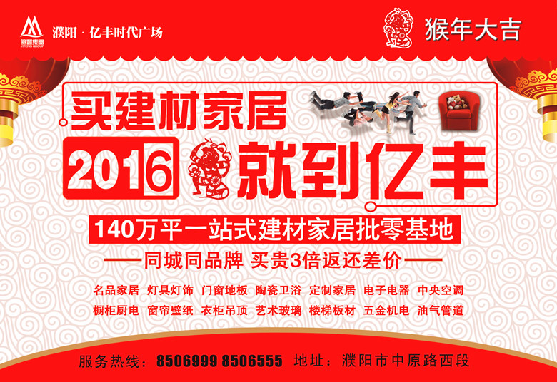 亿丰时代广场开业后必将全面升级濮阳建材家居商贸平台,成为濮阳规模最大、档次最高、产品最新颖、品种最齐全、价格最合理、服务最完善的建材家居大市场,满足濮阳人民购买建材家居“一站式”的购物需求。辐射周边鹤壁、安阳、新乡、荷泽等城市区域,消费人群达两千万人以上,真正形成“买建材家居就到亿丰!”的市场效应。