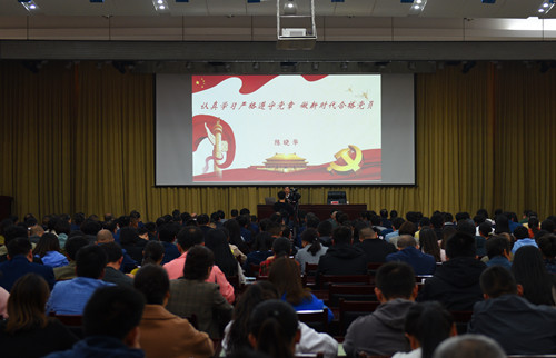 10月18日下午,区党工委书记陈晓华以《认真学习严格遵守党章 做新时代合格党员》为主题,为全区党员干部上了一堂“不忘初心、牢记使命”主题教育专题党课。他紧扣主题,从党章的历史沿革、党章的定位、十九大党章的变化、学习遵守十九大党章和党员领导干部做表率等五个方面进行了深入浅出的阐释。从革命年代的“冲锋号”到建设年代的“动员令”,再到改革年代的“宣言书”系统讲解了历次党章的重要地位和历史沿革,尤其对十九大党章的变化、亮点和重要意义进行了深入解读。陈晓华书记在主题党课上的讲话站位高远、思想深邃、内容丰富,是一堂既有政治高度又有理论深度的报告,为全区克难攻坚、转型发展坚定了必胜信心。同时,勉励全区党员干部要自觉学习党章、遵守党章、贯彻党章、维护党章,紧密结合当前开展的“不忘初心、牢记使命”主题教育,牢记初心使命,勇于担当作为,做新时代合格党员,奋力谱写濮阳更加出彩绚丽的经开区篇章。