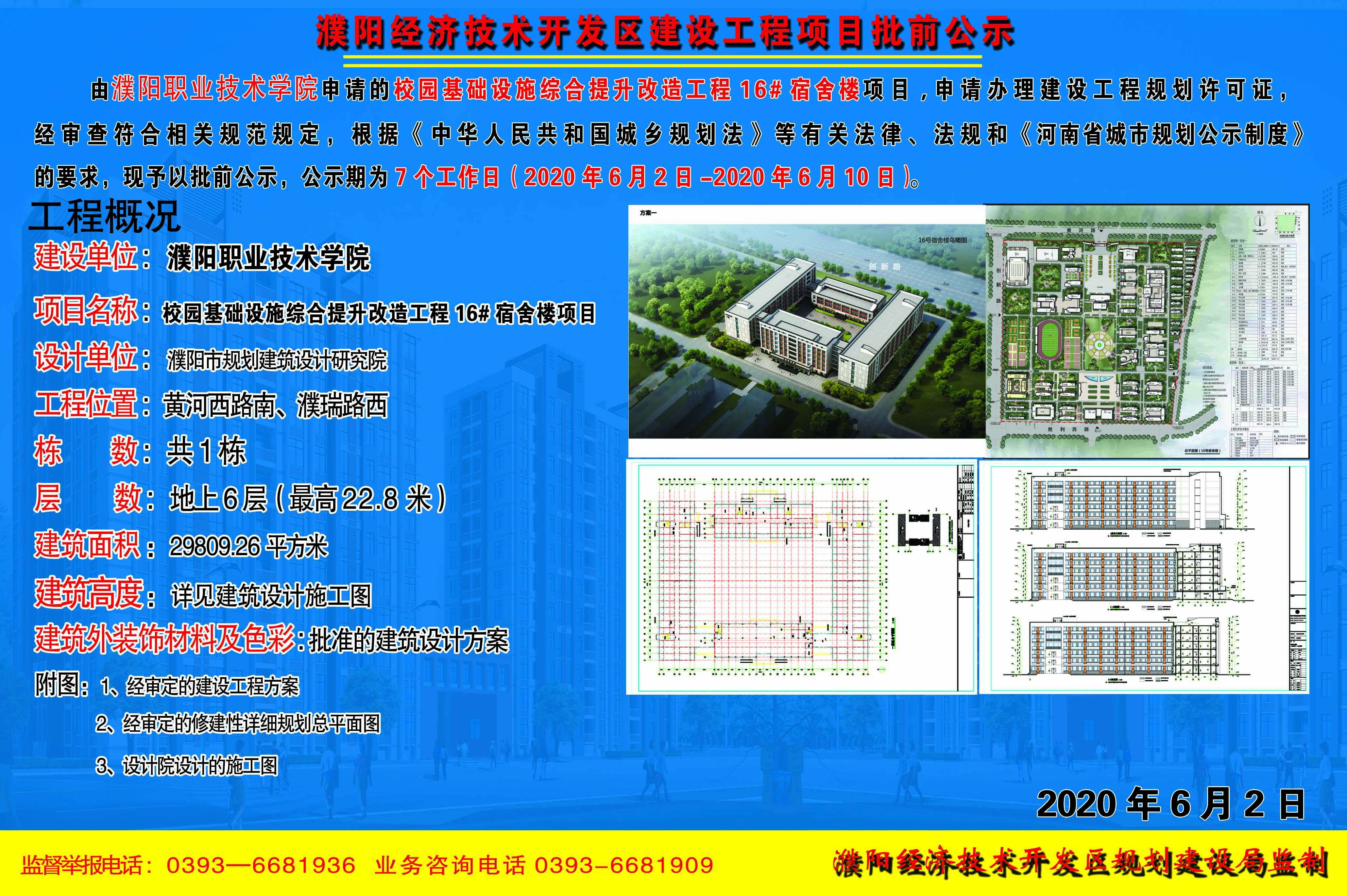 濮阳职业技术学院申请的校园基础设施综合提升改造工程16#宿舍楼项目建设工程规划许可公示(批前)