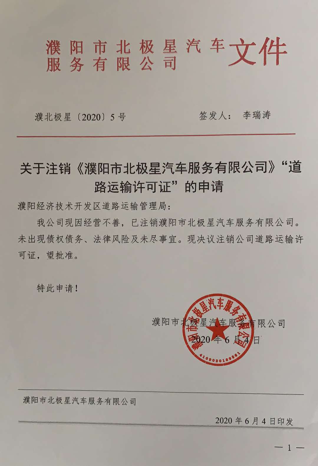 关于注销《濮阳市北极星汽车服务有限公司》“道路经营许可证”的公告