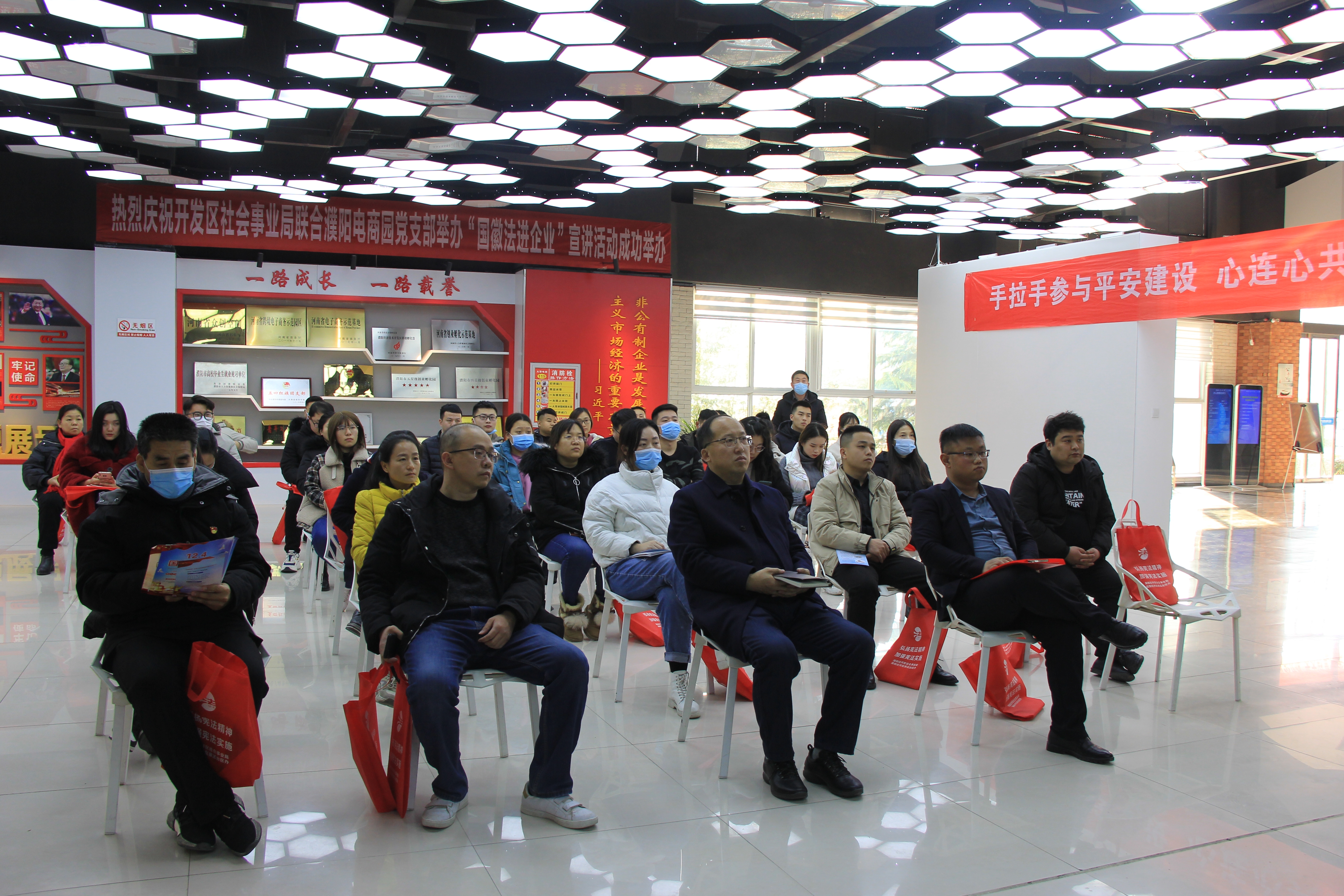 12月16日,区社会事业局走进电商园联合园区党支部开展《国徽法》宣讲活动。区社会事业局副局长梁吉高,河南濮阳电子商务产业园管理有限公司副总经理宋钢豹出席活动,园区党员、预备党员和企业员工代表等50多人参加活动。