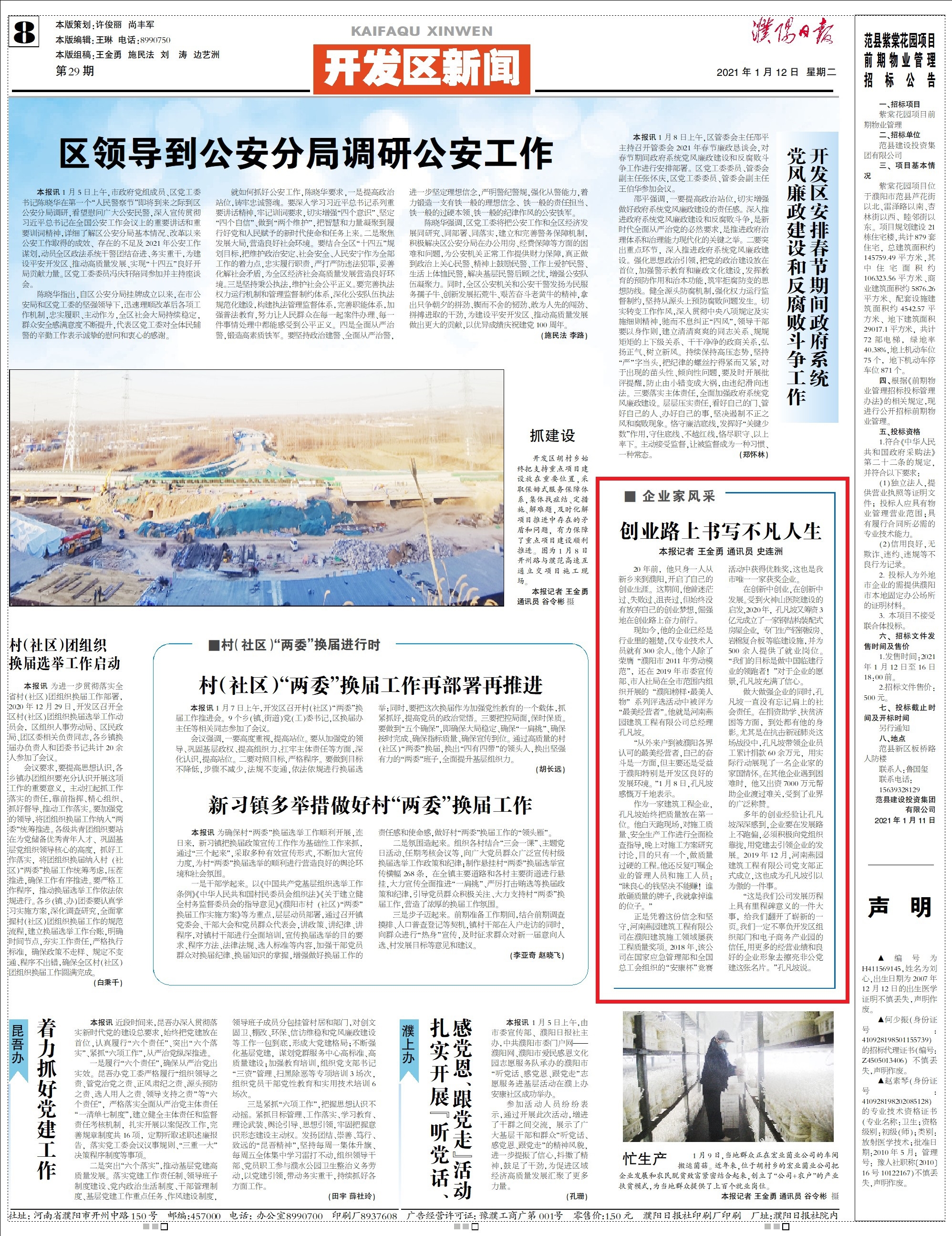 为弘扬企业家精神,营造激励企业家干事创业的社会氛围,河南濮阳电商园联合开发区宣统办,濮阳日报,对河南燕园建筑工程有限公司总经理孔凡坡进行专访,全方位、多角度了解开发区电商园企业家及其企业的发展历程、经营成效、未来目标等。