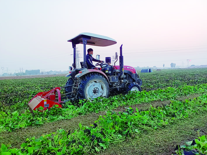 连日来,天气持续好转,墒情得到缓解。我市各县区农民迅速走上田畴阡陌,腾茬整地,抢收抢种。图为10月26日,开发区昆吾办胡王合村农民李道乾在用红薯秧粉碎机粉碎红薯秧。