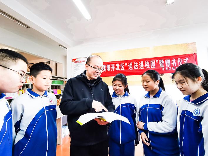 10月25日,开发区开展“送法进校园”暨赠书仪式活动,区司法办工作人员围绕与学生息息相关的法律知识,以法论事,用通俗易懂的语言为开发区实验学校师生上了一堂生动的法治教育课,并向该校赠送普法知识读本500本。图为工作人员向学生介绍法律知识读本。