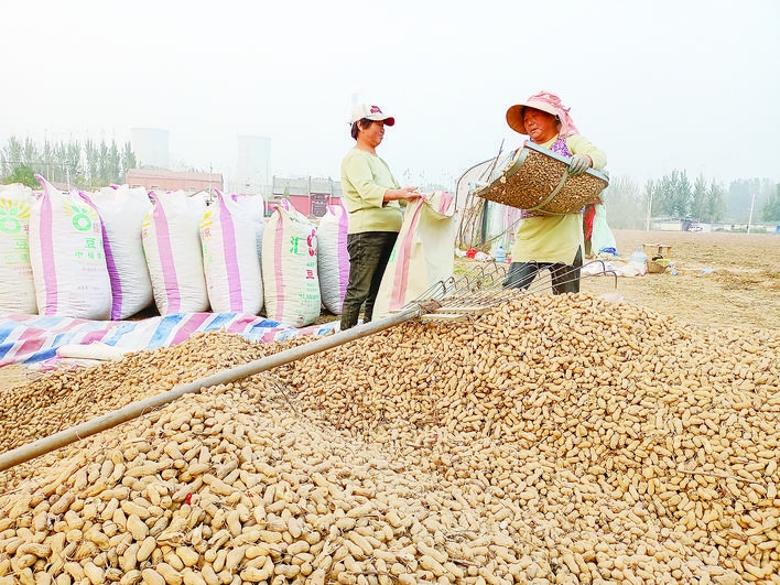 时已立冬,又到了“柴草归垛粮归仓”的时候。连日来,我市各县区农民抢抓天气晴好的有利时机,摊晒粮食,打场入仓,田间地头处处可见忙碌的身影。图为11月14日,开发区濮水办前漳消村农民将晾晒好的花生装袋,准备入仓。