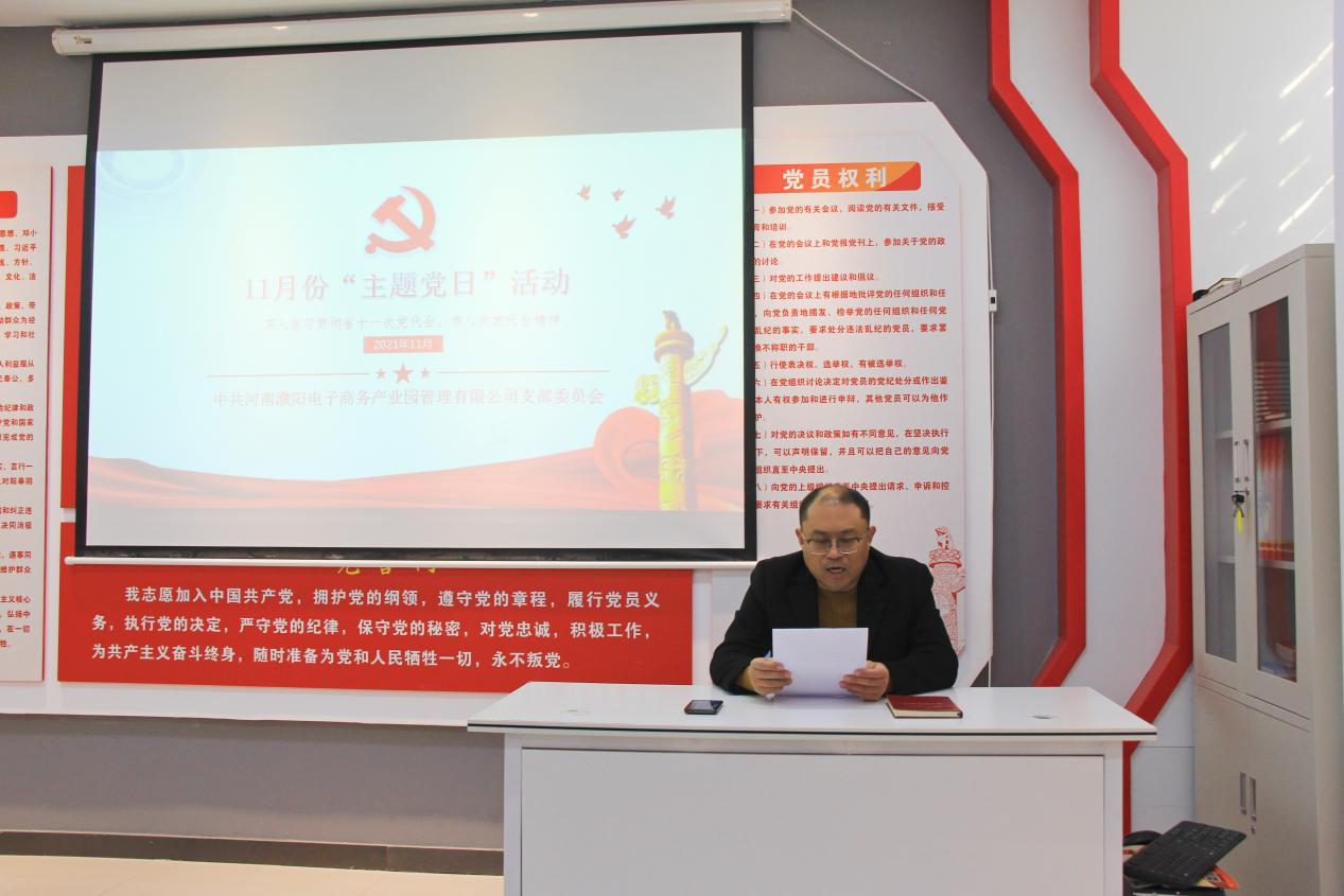 11月26日,河南濮阳电子商务产业园管理有限公司党支部组织召开党员大会暨11月份“主题党日”,党支部书记刘杰主持会议,园区党员同志参加会议。