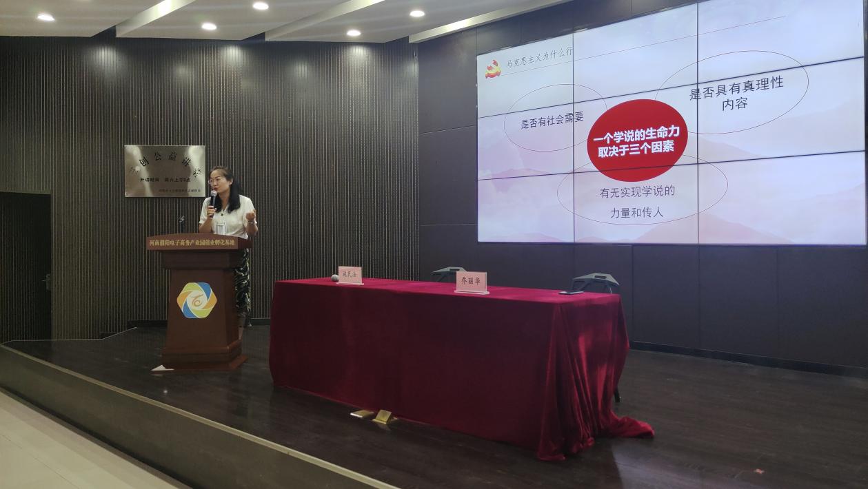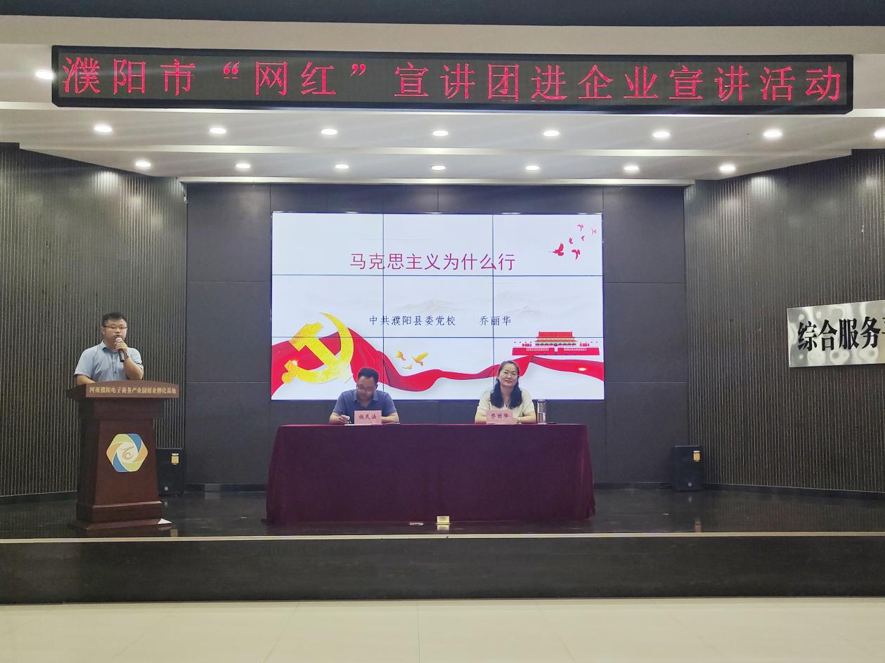 为做好“党的创新理论”宣讲工作,6月23日,喜迎二十大濮阳市“网红”宣讲团进企业宣讲暨电商园党支部六月份“主题党日”活动成功举办。开发区宣统办副主任施民法出席活动,中共濮阳县委党校科研室副主任乔丽华作《马克思主义为什么行》主题宣讲。