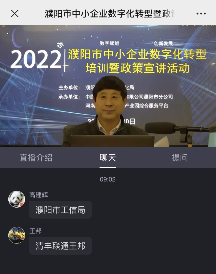 市工信局三级调研员张龙海,濮阳联通副总经理郑建彬出席本次活动,濮阳市150余家中小企业代表受邀参加线上直播培训。