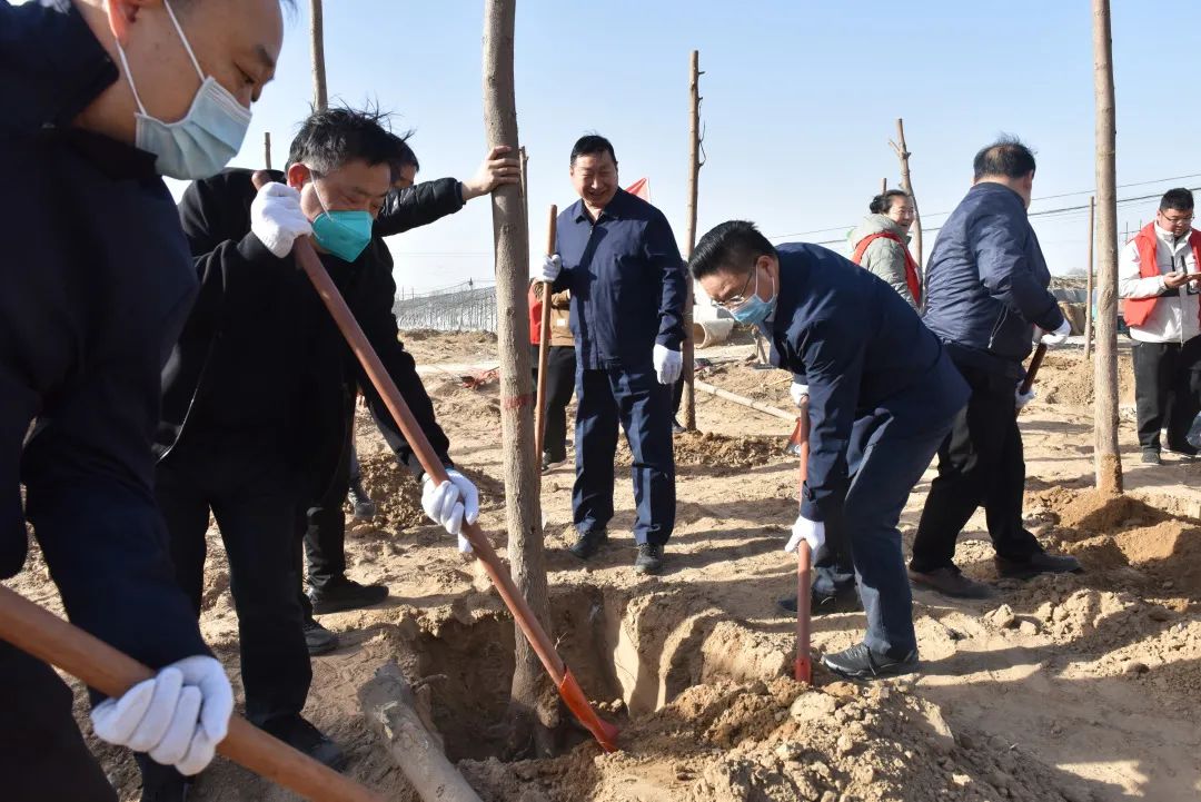 在王助镇冯寨村植树点,梅兴秦与干部职工一起搬运树苗、扶树对齐、挥铲培土,植树现场一派繁忙有序、热火朝天的劳动景象。