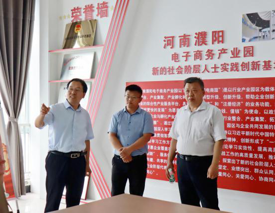 7月19日,市委统战部副部长朱腾强莅临电商园调研指导濮阳经开区新的社会阶层人士联谊会及实践创新基地建设工作。区党工委委员车建乐,区宣统办副主任乔永民陪同调研,电商园副总经理宋钢豹陪同接待。
