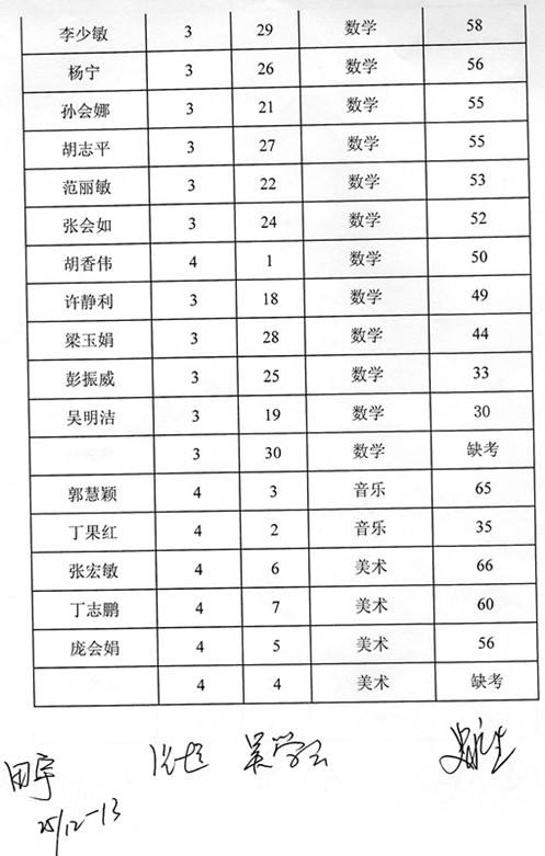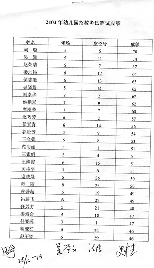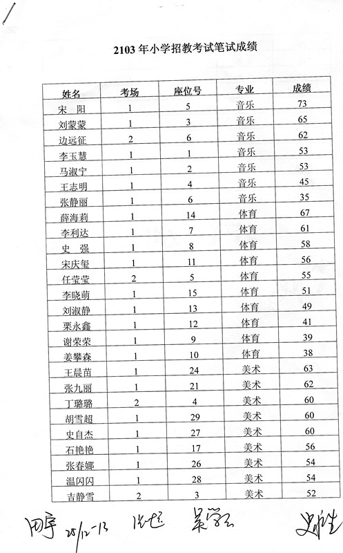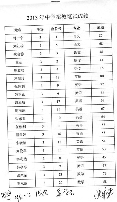 本次考试采取异地批卷形式,因考生本人书写不规范,名字中出现错别字,现声明如下:2013年中学招教笔试成绩单中“张东亚”应为“张庆亚”、“丁果红”应为“丁军红”;2013年小学招教考试笔试成绩单中“姜攀森”应为“姜登森”;2013年幼儿园招教考试笔试成绩单中“梁志伟”应为“梁志沛”、“谢小晟”应为“谢小晨”。
