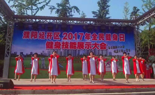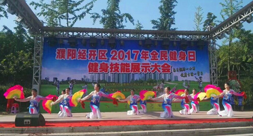 8月8日上午,由区社会事业局主办,昆吾办承办的《2017濮阳经开区全民健身日健身技能展示大会》在安康苑隆重举行,社会事业局、宣统办、文明办、昆吾办及龙舞韵志愿服务队共400余人参加了健身技能展示活动。现代舞,古典舞,水兵舞,健身球,健身操,健身秧歌,时装优秀等12类健身技能进行了展示。