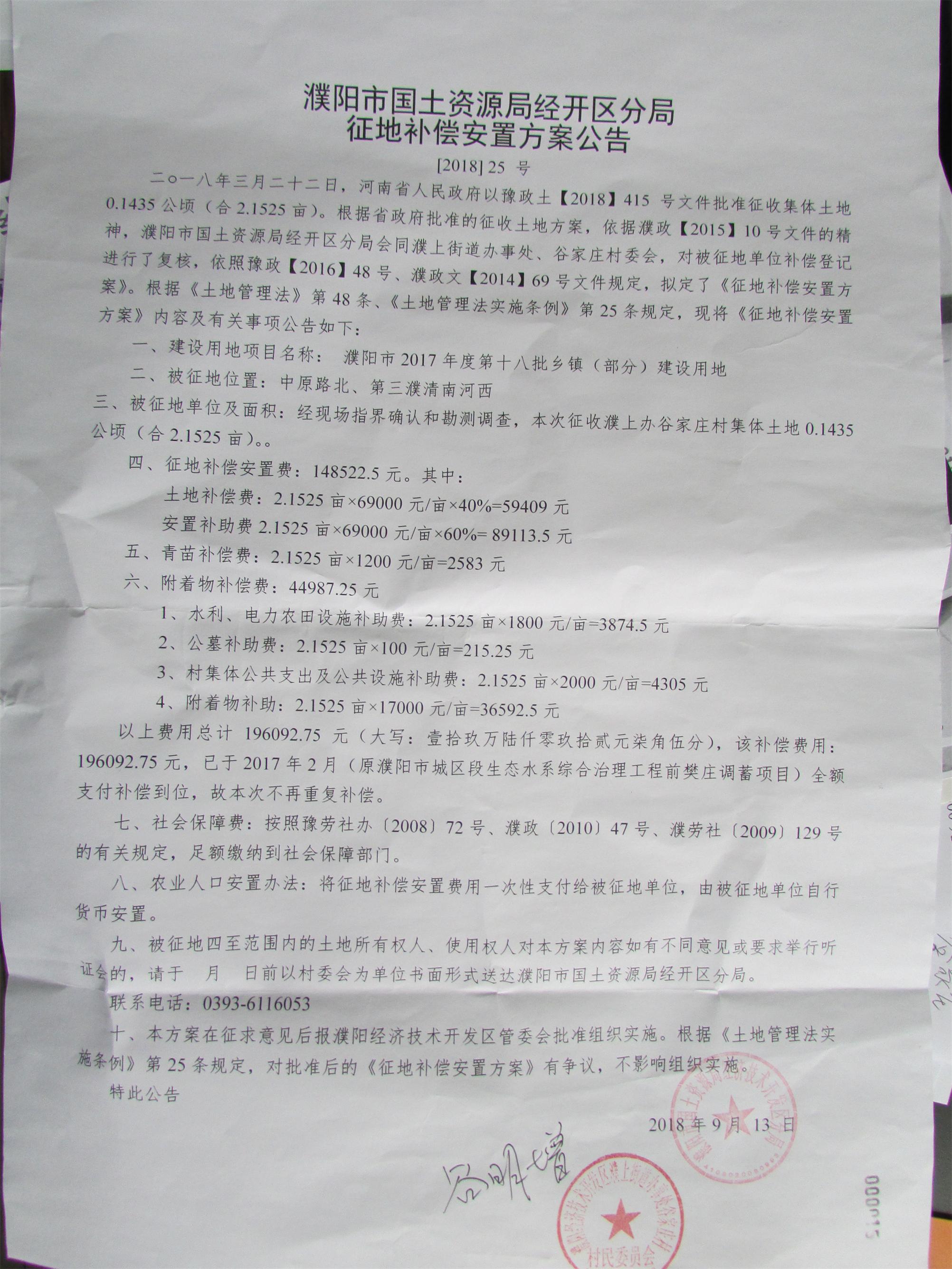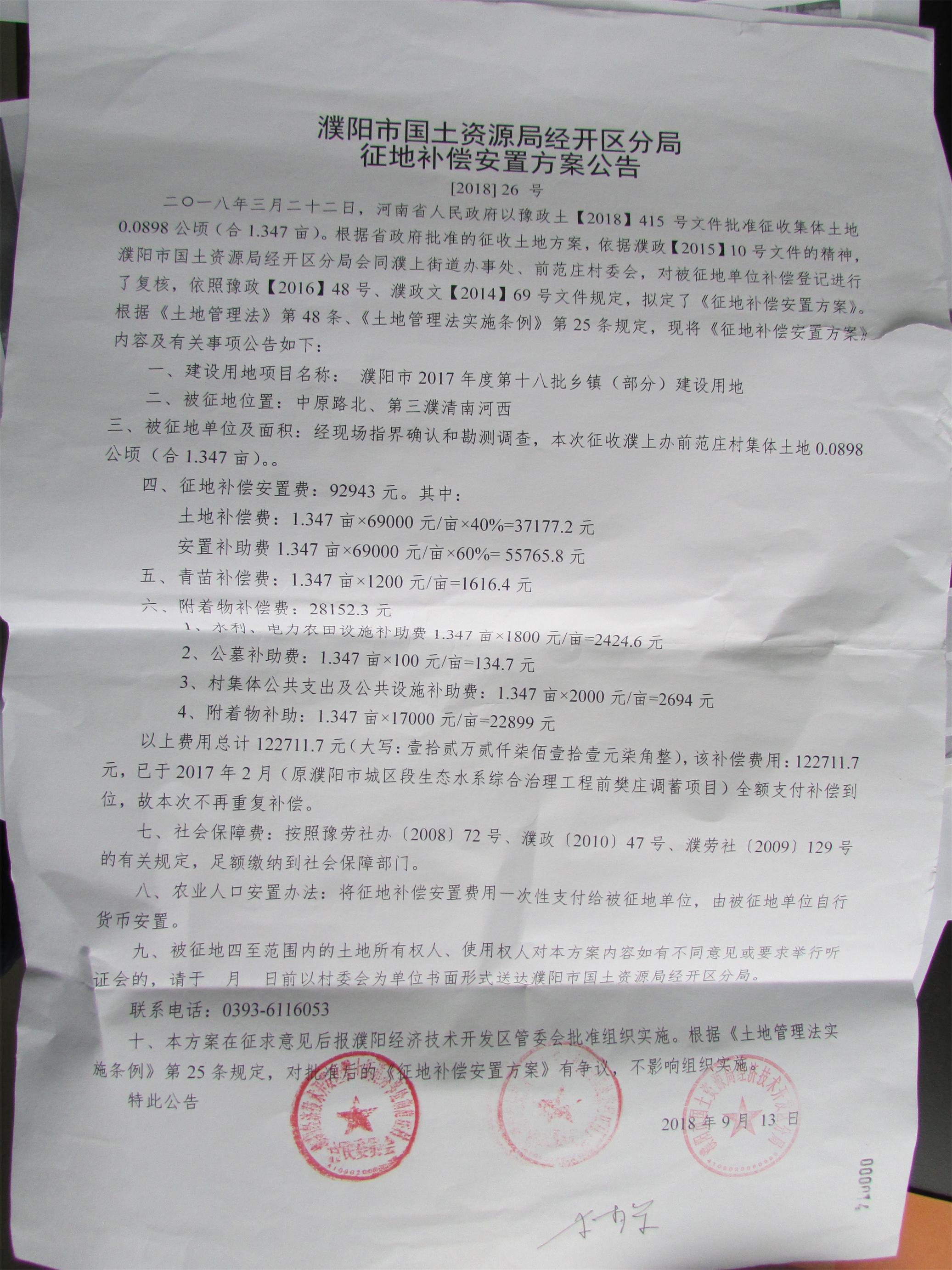 濮阳市国土资源局经开区分局征地补偿安置方案公告【2018】25号,26号