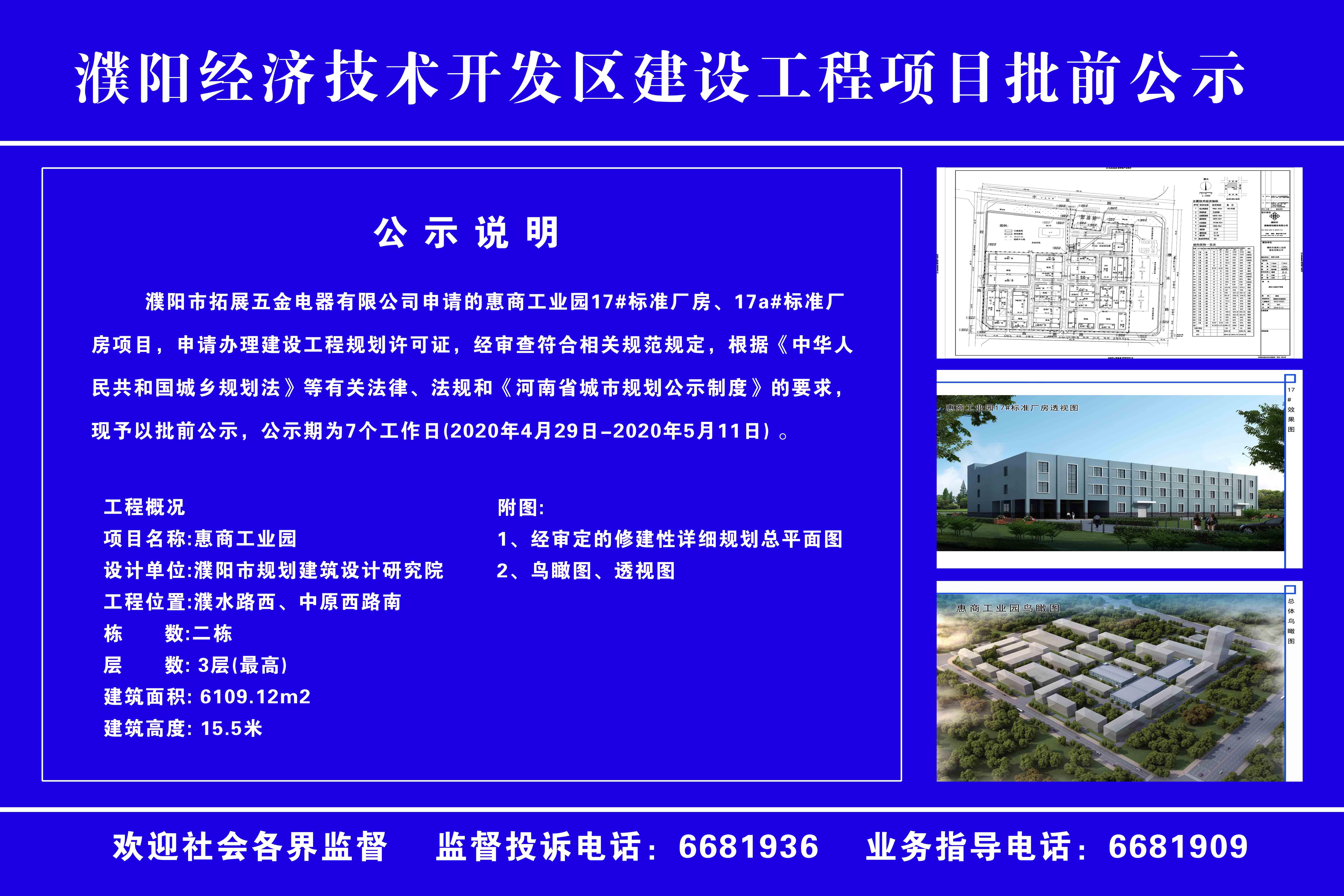 濮阳市拓展五金电器有限公司申请的惠商工业园17#标准厂房、17a#标准厂房项目建设工程规划许可公示(批前)