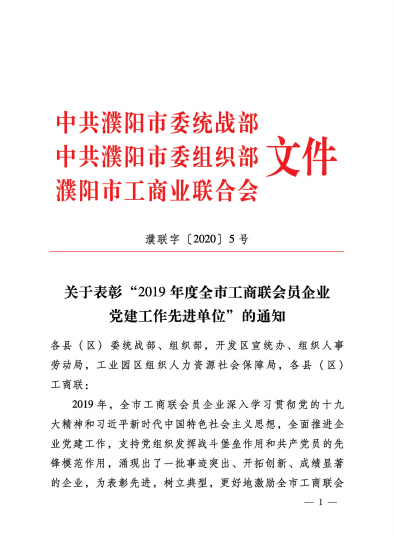 6月29日,《关于表彰“2019年度全市工商联会员企业党建先进单位”的通知》评选结果公示,河南濮阳电子商务产业园荣获“2019年度全市工商联会员企业党建先进单位”荣誉称号。