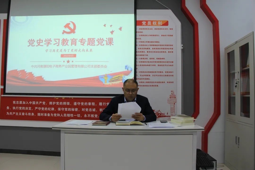 4月13日下午,河南濮阳电子商务产业园管理有限公司党支部组织开展党史学习教育专题党课,在党支部书记刘杰的带领下,公司全体党员同志认真学习以党史学习教育为主题的课程。