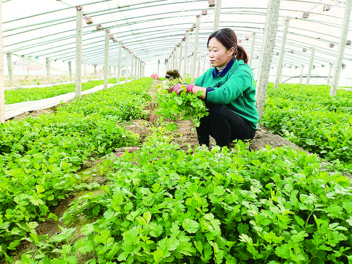 王素利是开发区新习镇西别寨村人,先前曾在江苏苏州等地务工。2017年,她返乡创业,投建7座温室大棚,发展绿色无公害蔬菜种植,年增收约10万元。时令进入数九寒天,王素利大棚里的蒜苗、芹菜、西蓝花等反季节蔬菜青绿一片,喜获丰收。图为2021年12月27日,王素利在大棚里收获香菜。