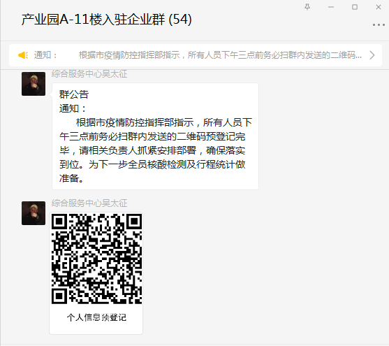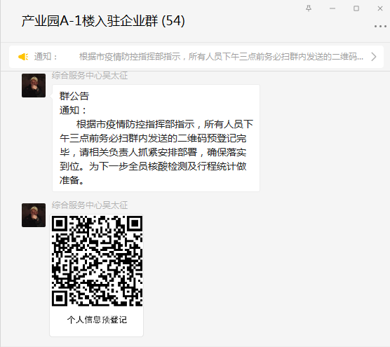 二、根据市疫情防控指挥部要求,做好园区内企业个人信息预登记工作,为下一步全员核酸检测及行程统计做准备。