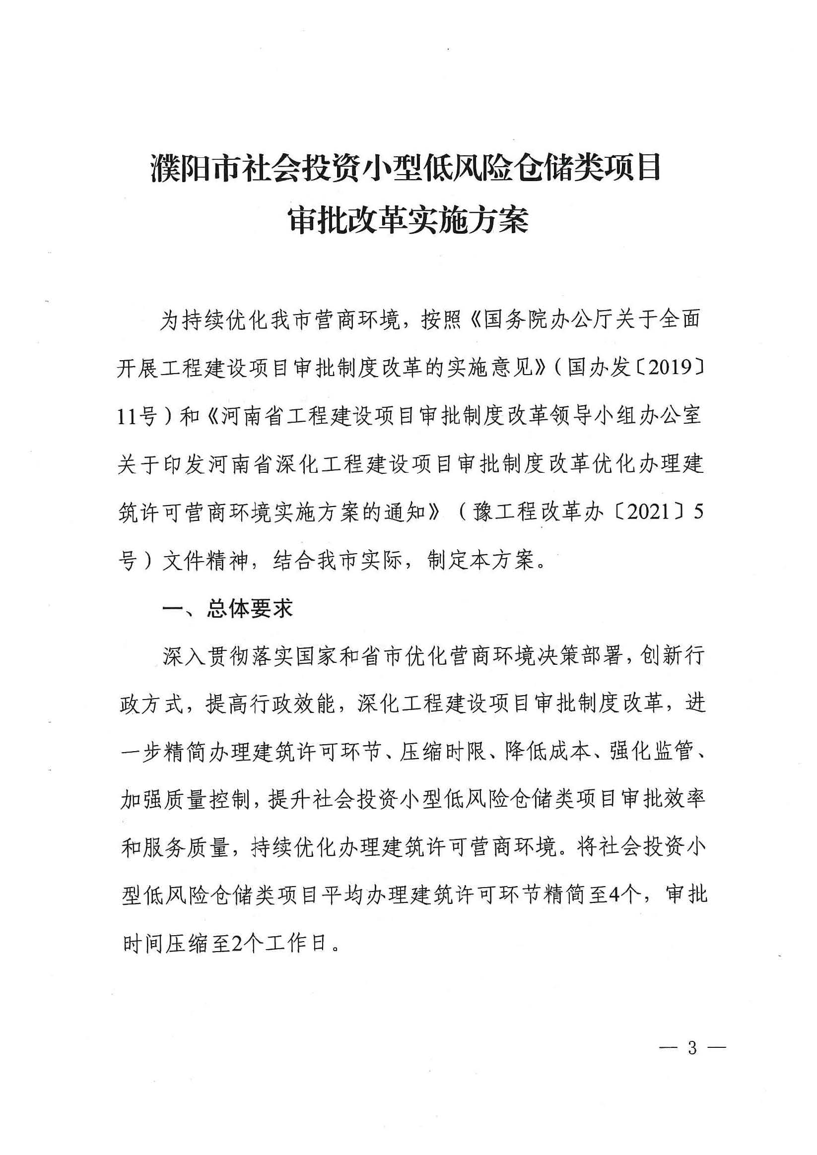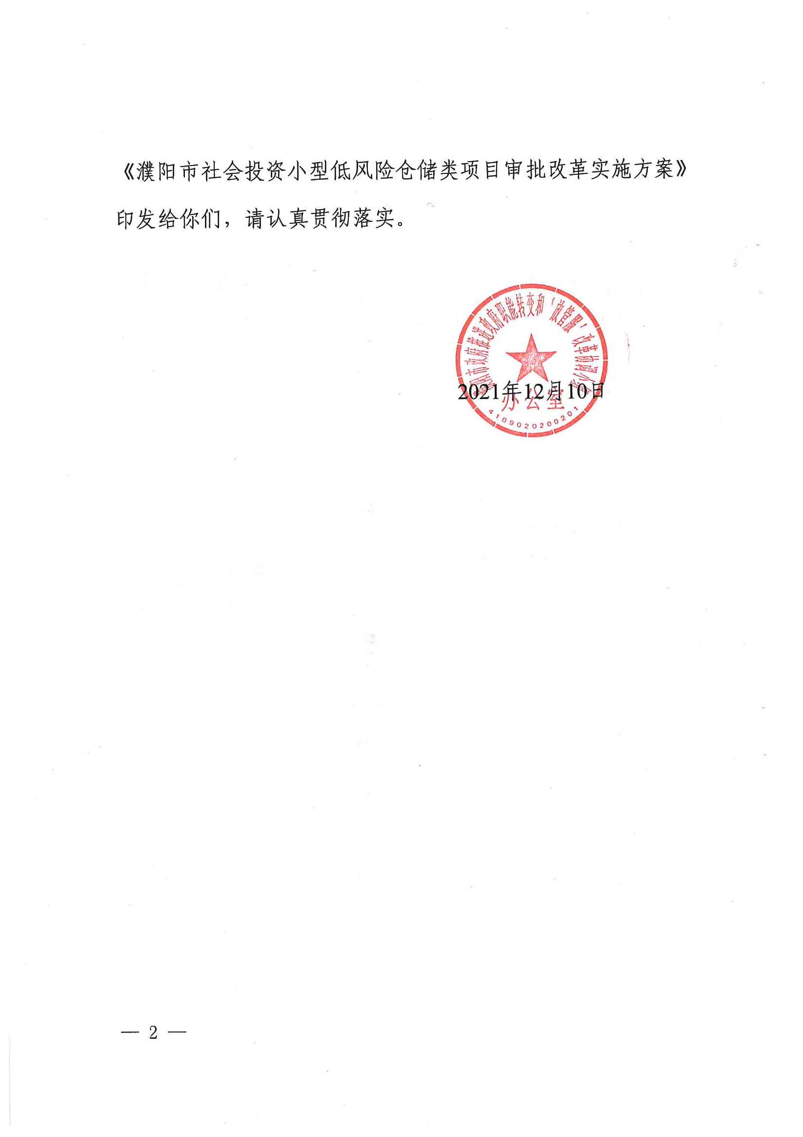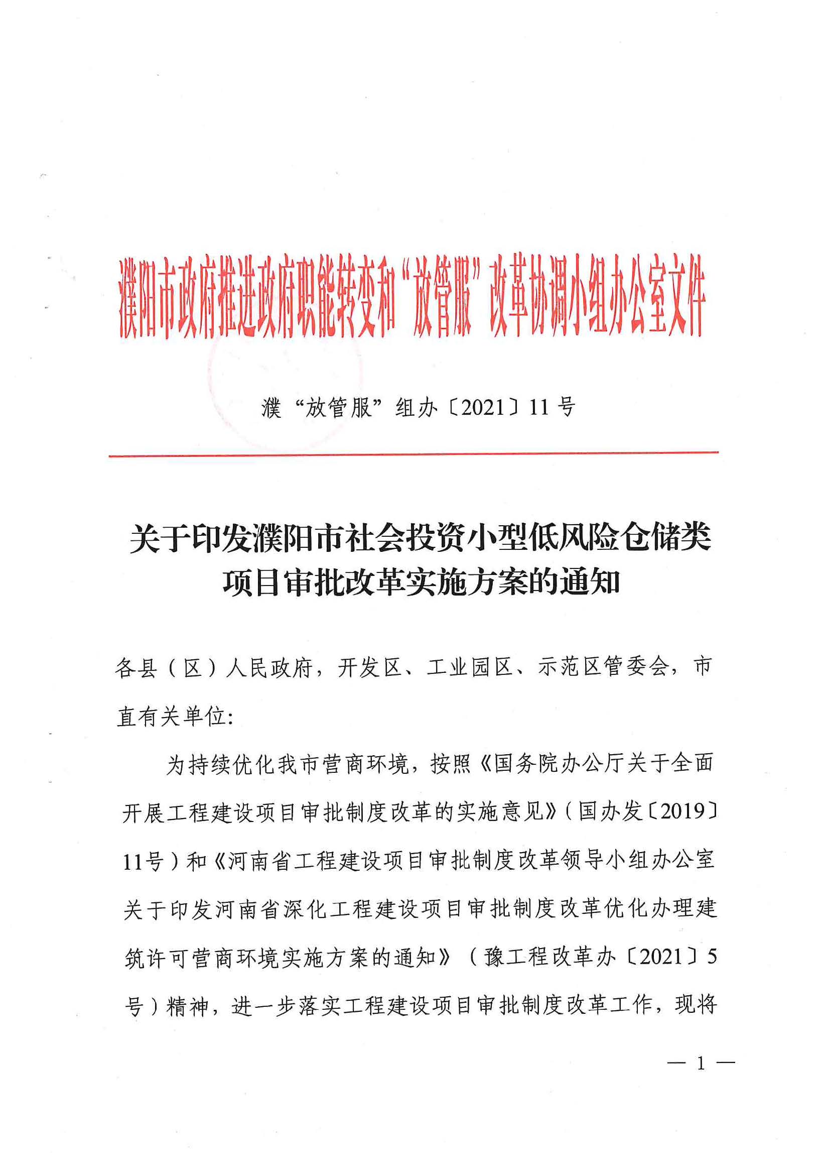 濮阳市政府推进政府职能转变和“放管服”改革协调小组办公室关于印发濮阳市社会投资小型低风险仓储类项目审批改革实施方案的通知 濮“放管服”组办(2021)11号