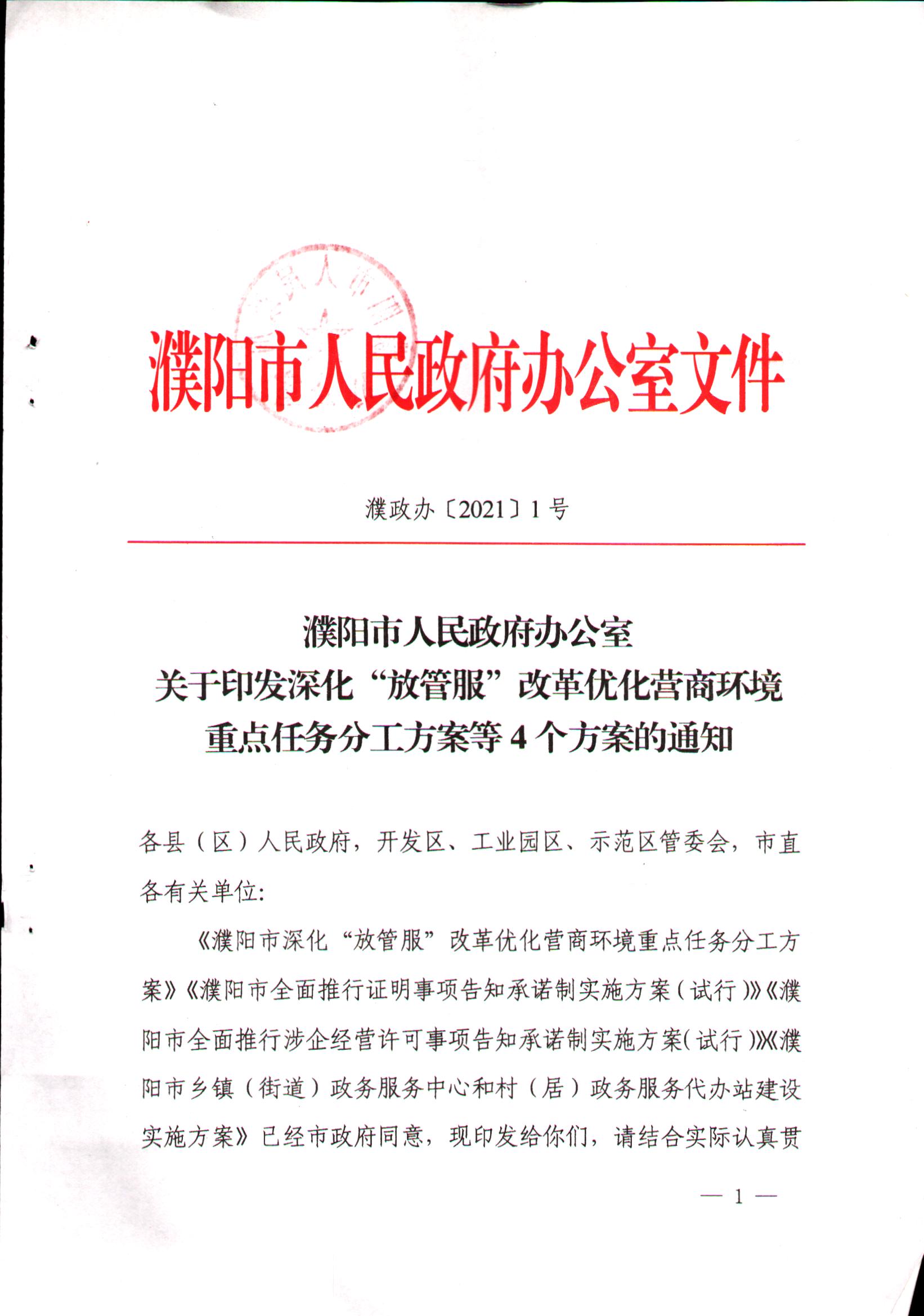 濮阳市人民政府办公室关于印发深化“放管服”改革优化营商环境重点任务分工方案等4个方案的通知