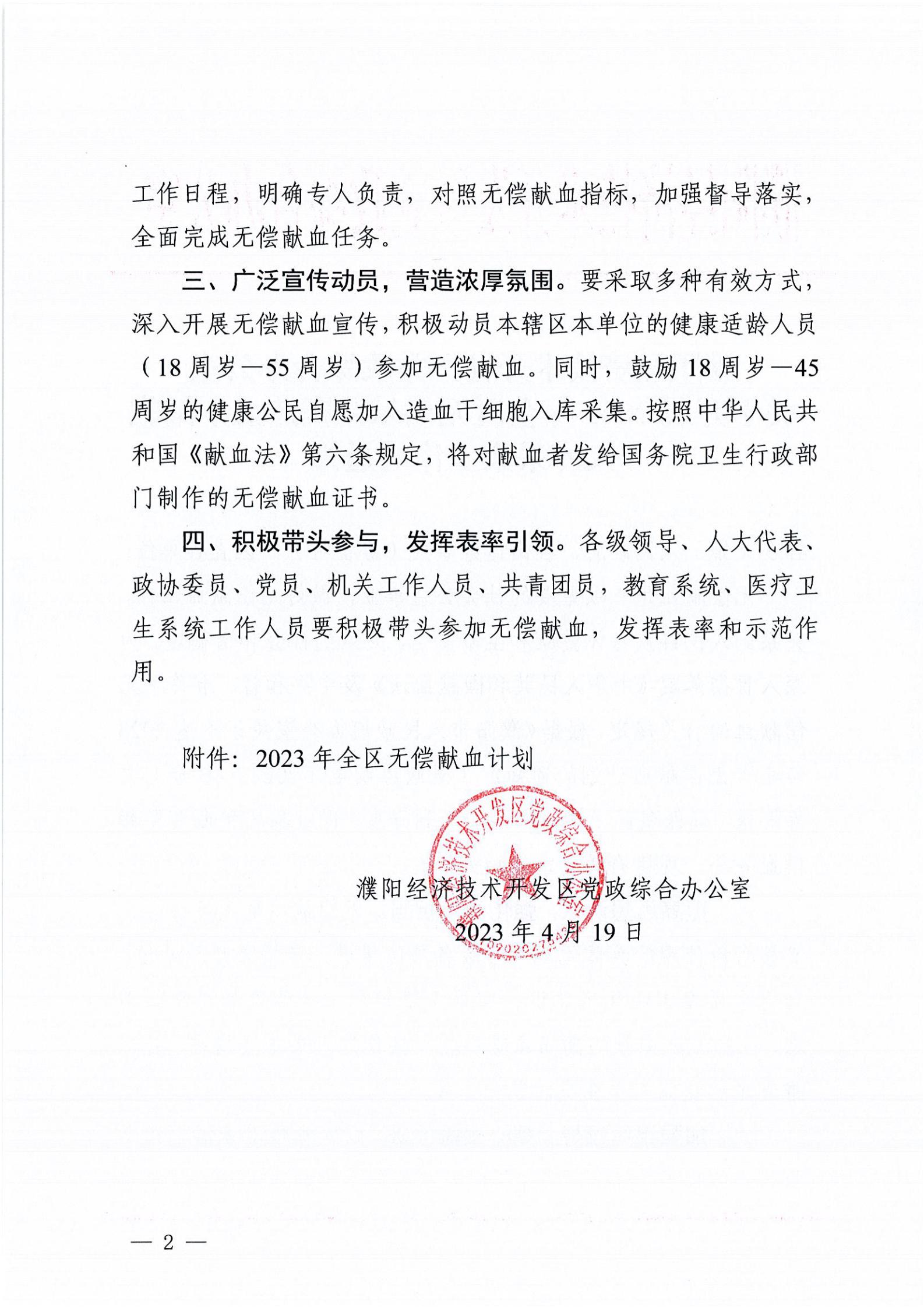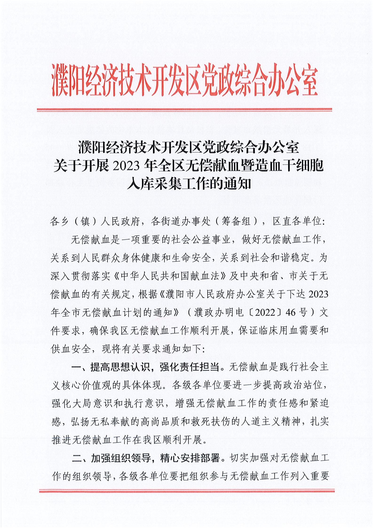 濮阳经济技术开发区党政综合办公室关于开展2023年全区无偿献血暨造血干细胞入库采集工作的通知