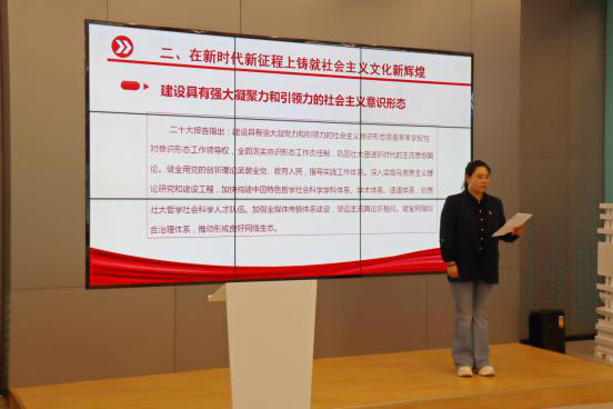 通过此次宣讲活动,使大家深刻认识到,在新时代新征程上,我们必须始终坚持马克思主义在意识形态领域指导地位的根本制度,坚持为人民服务、为社会主义服务,坚持百花齐放、百家争鸣,坚持创造性转化、创新性发展,以社会主义核心价值观为引领,发展社会主义先进文化,巩固全党全国各族人民团结奋斗的共同思想基础,不断提升国家文化软实力和中华文化影响力。