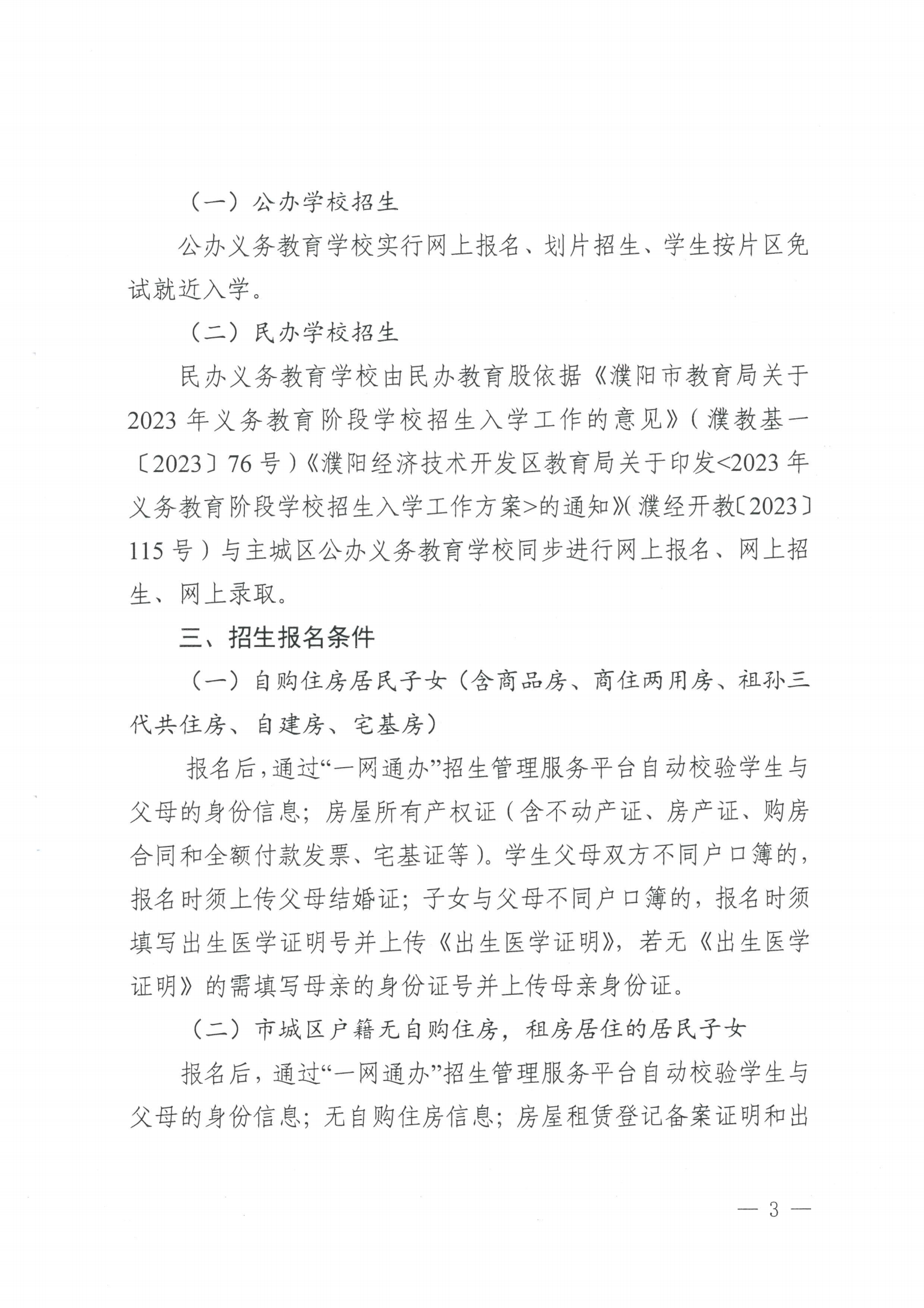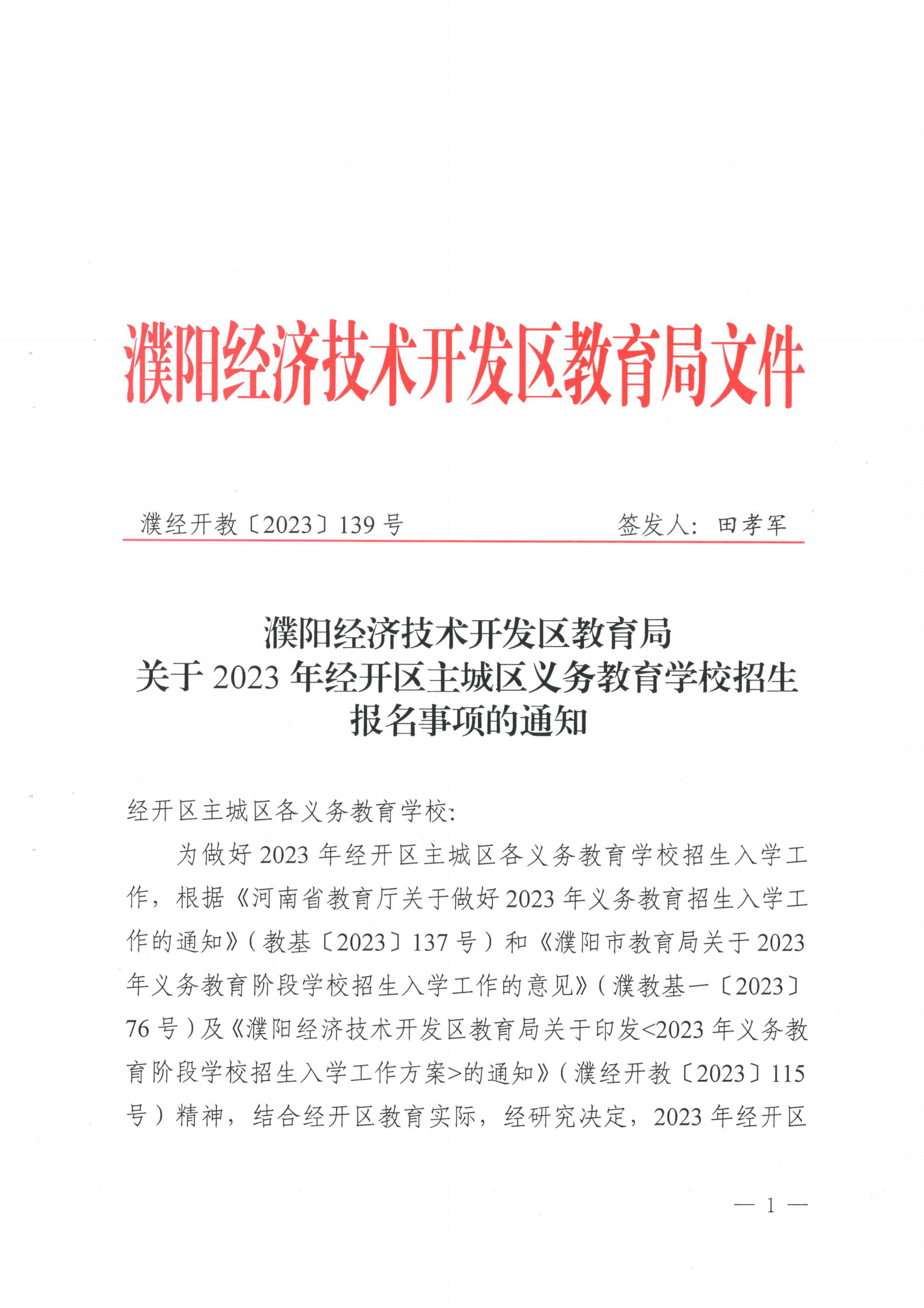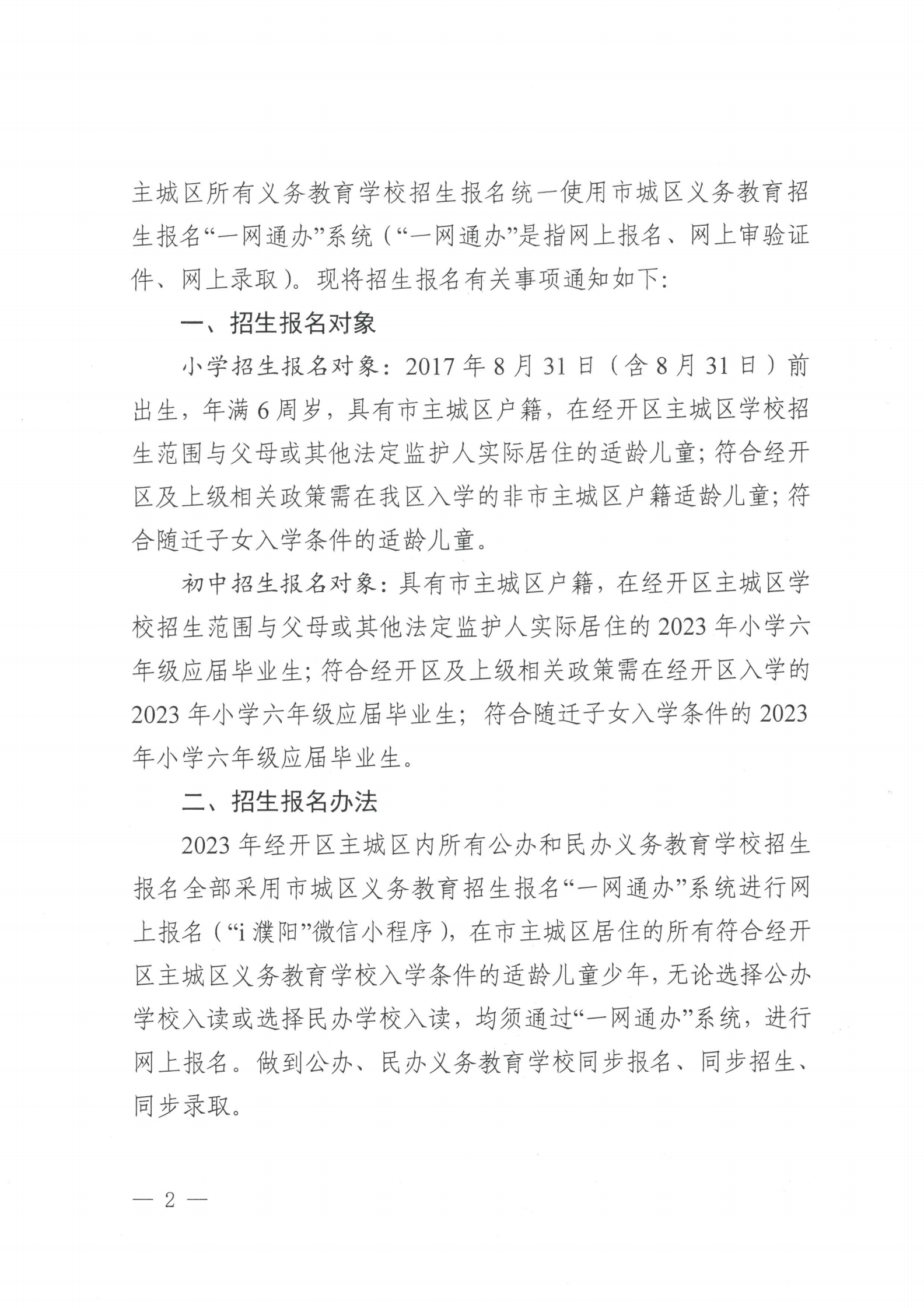 濮阳经济技术开发区教育局关于2023年经开区主城区义务教育学校招生报名事项的通知