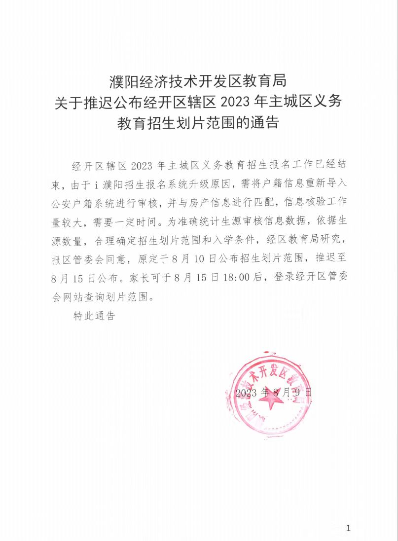 濮阳经济技术开发区教育局关于推迟公布经开区辖区2023年主城区义务教育招生划片范围的通告